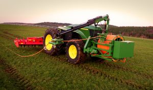 A drum fixed to the tractor carries up to 1000m of cable, although the length can be extended if required. In the field, the cable is fed out and reeled in while guided by a robot arm to keep the operation friction free and at low load. An intelligent guidance system is also used to prevent the tractor running into or over the cable.